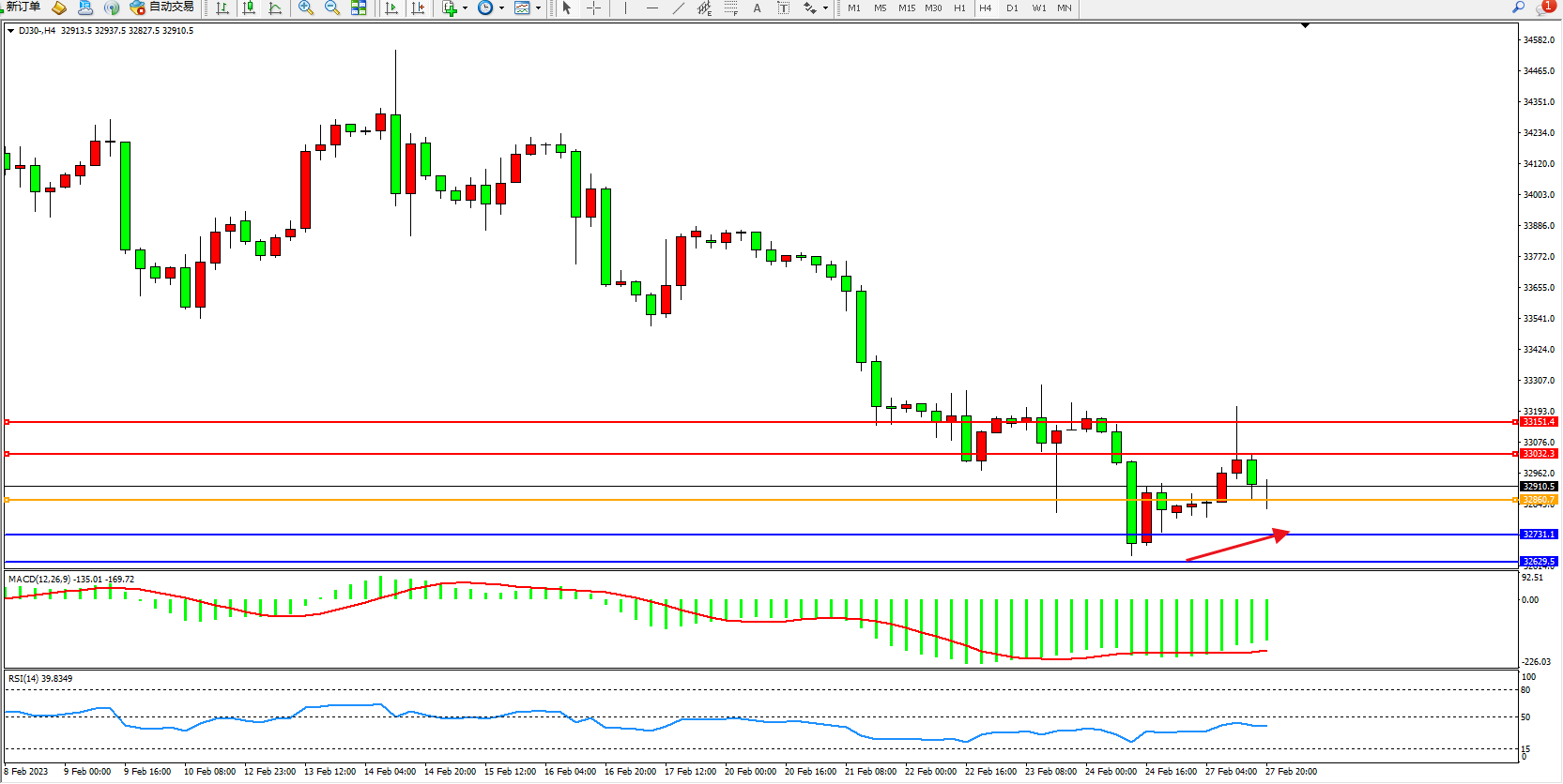 道琼斯指数DJ30——4小时K线图显示: