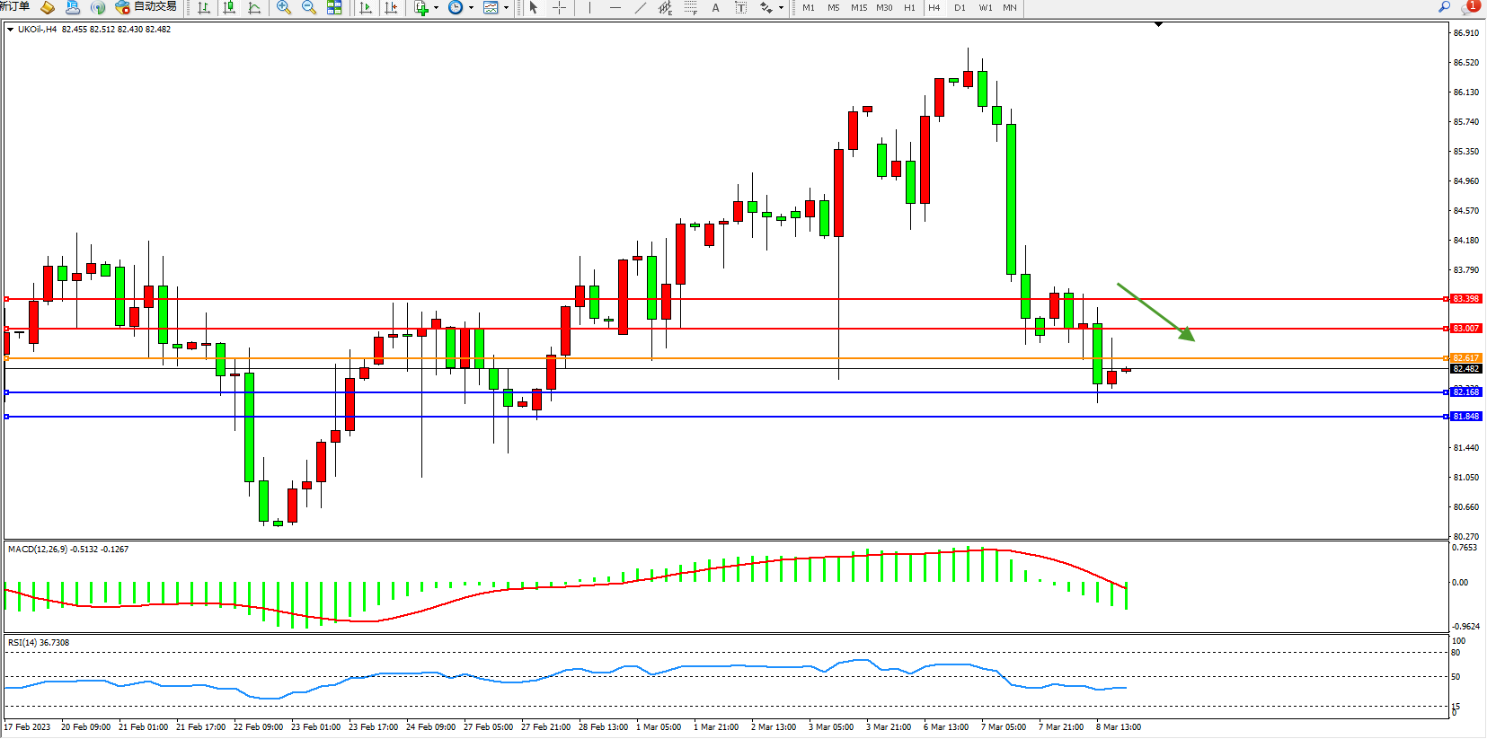 交易策略:82.617下方看跌,目标82.168 81.848