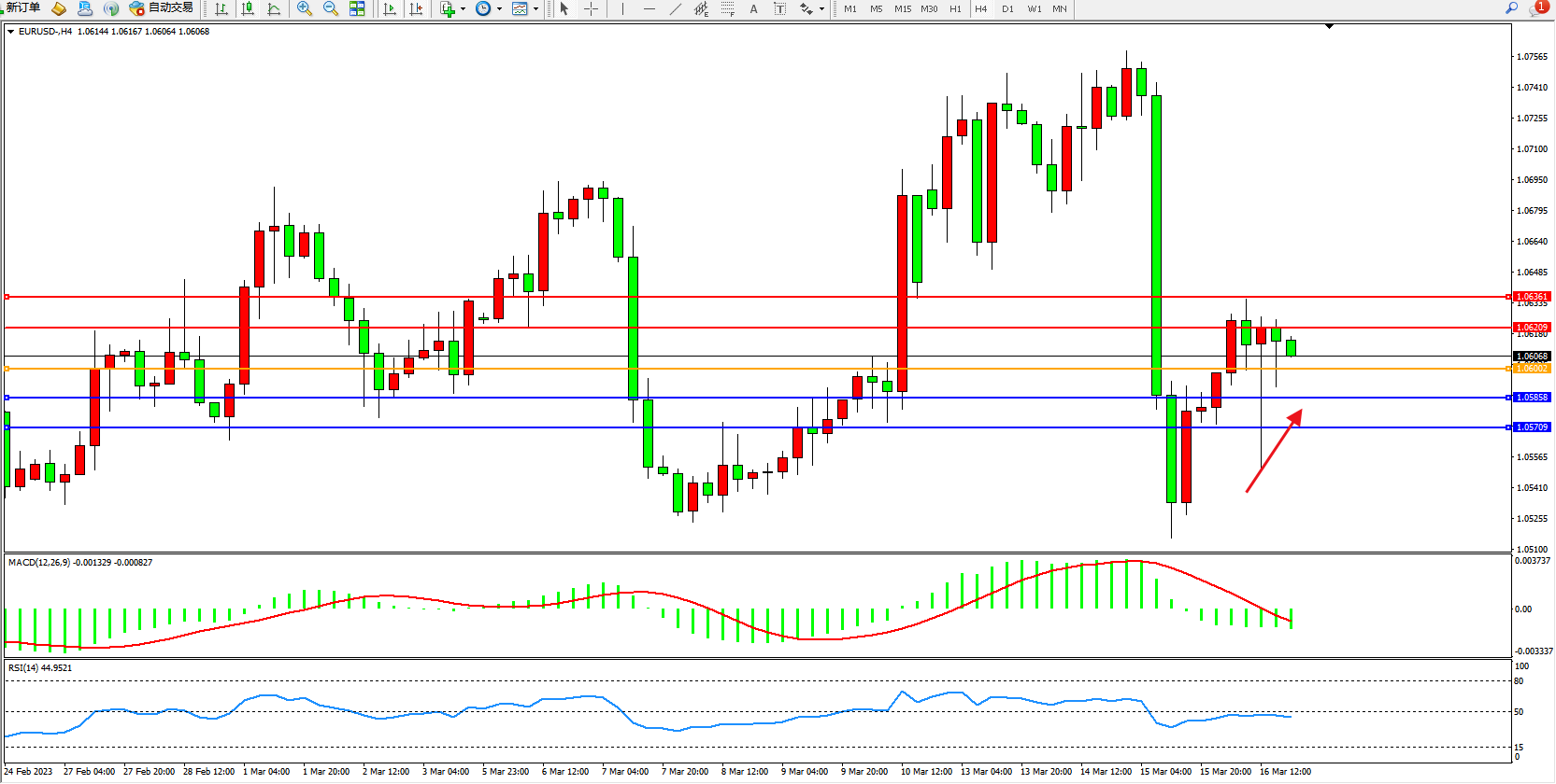 欧元美元EURUSD—4小时K线图显示: