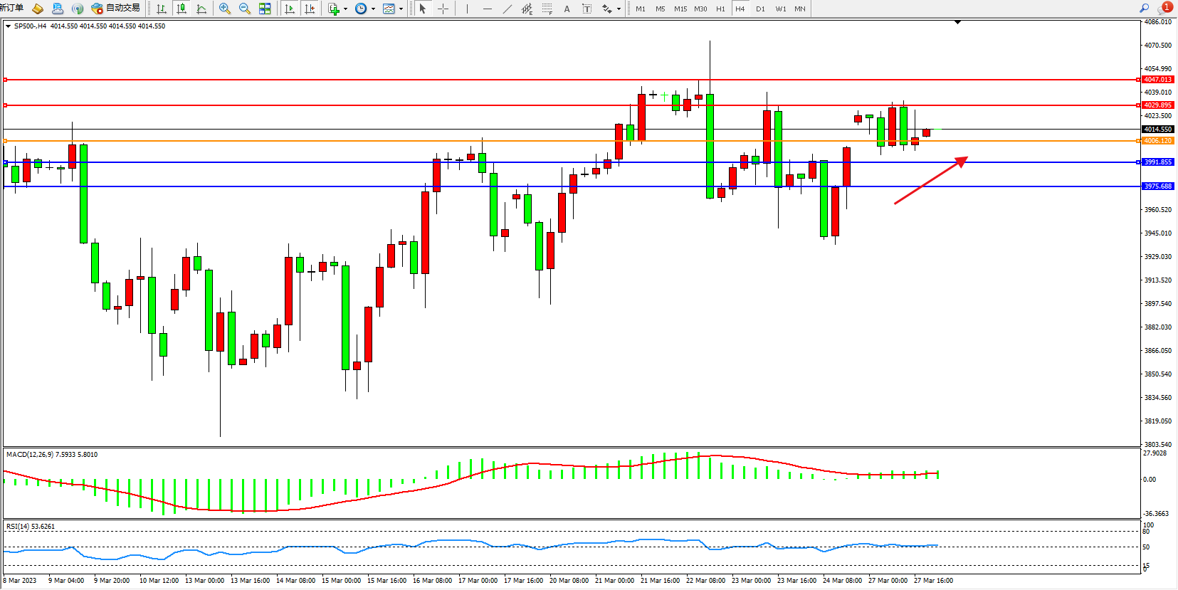 标普SP500——4小时K线图显示: