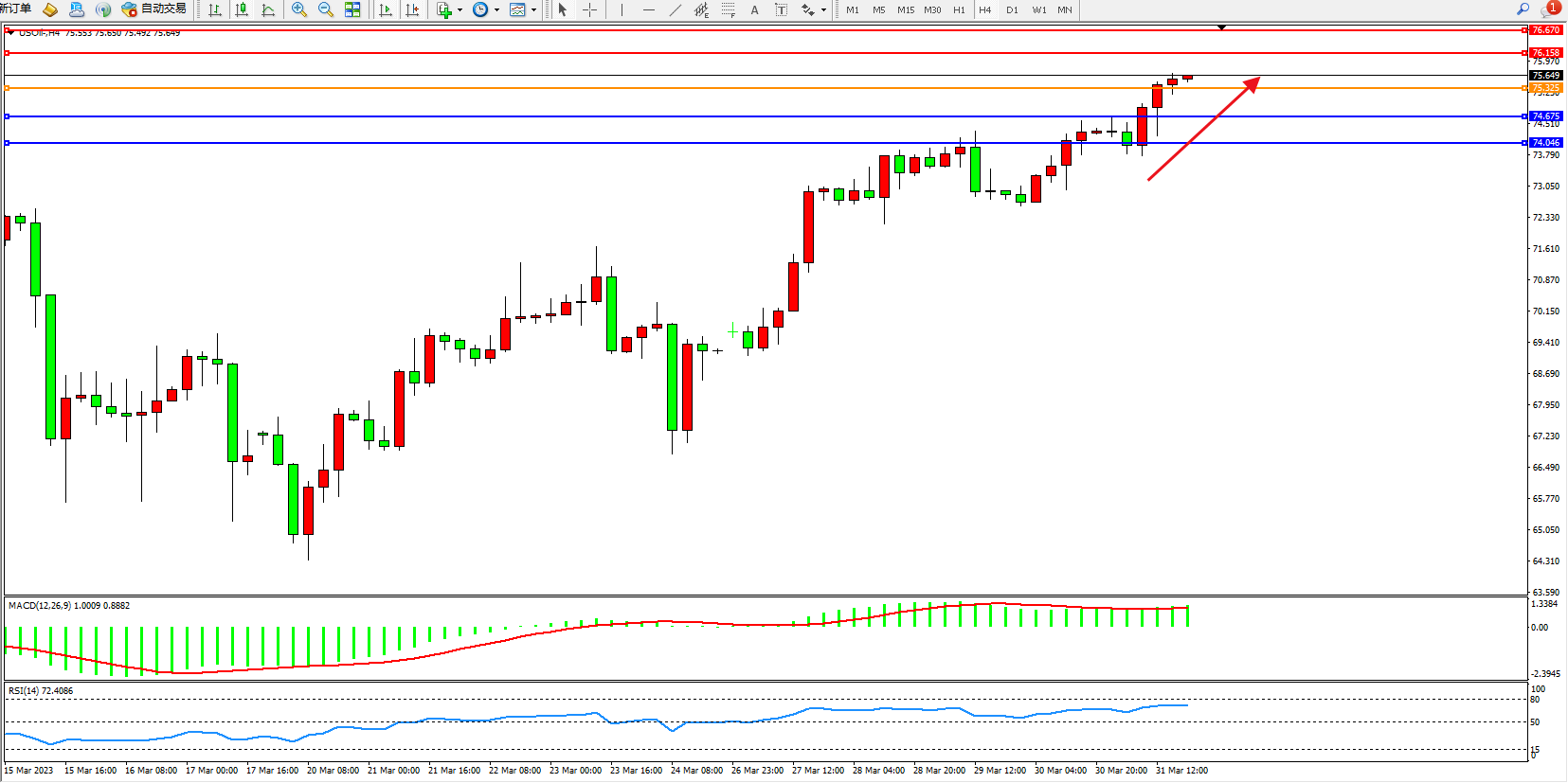 交易策略:75.325上方看涨,目标76.158 76.670
