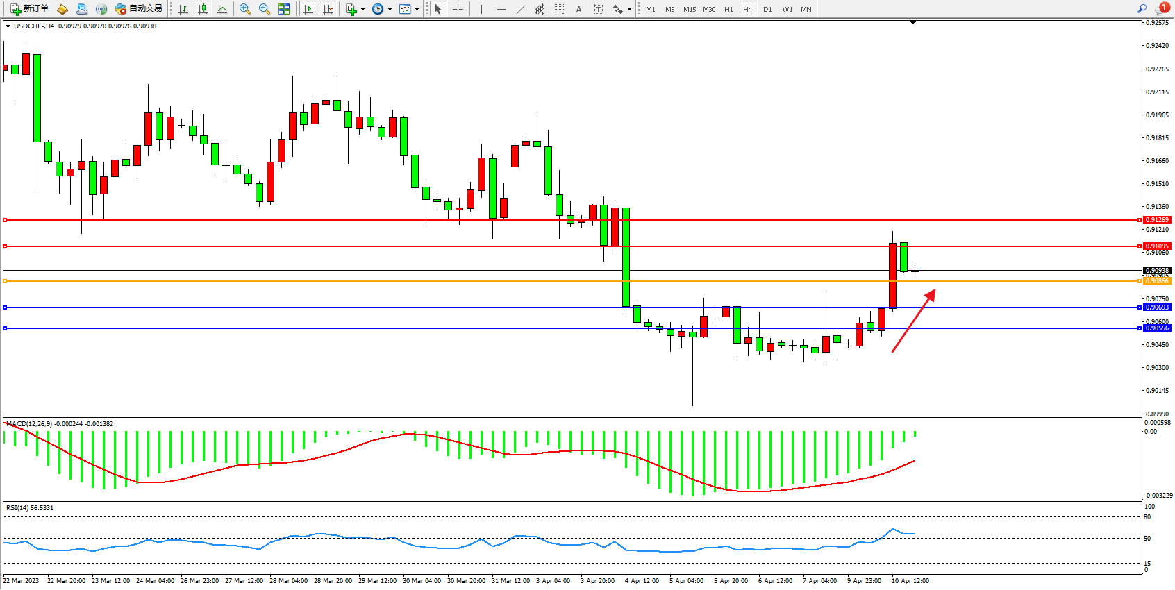 4小时图看:短期低位窄幅震荡后拉升上扬,市场多头情绪开始不断涌现,MACD指标处于空头区域低位上行,RSI指标处于50均衡线上側徘徊;
