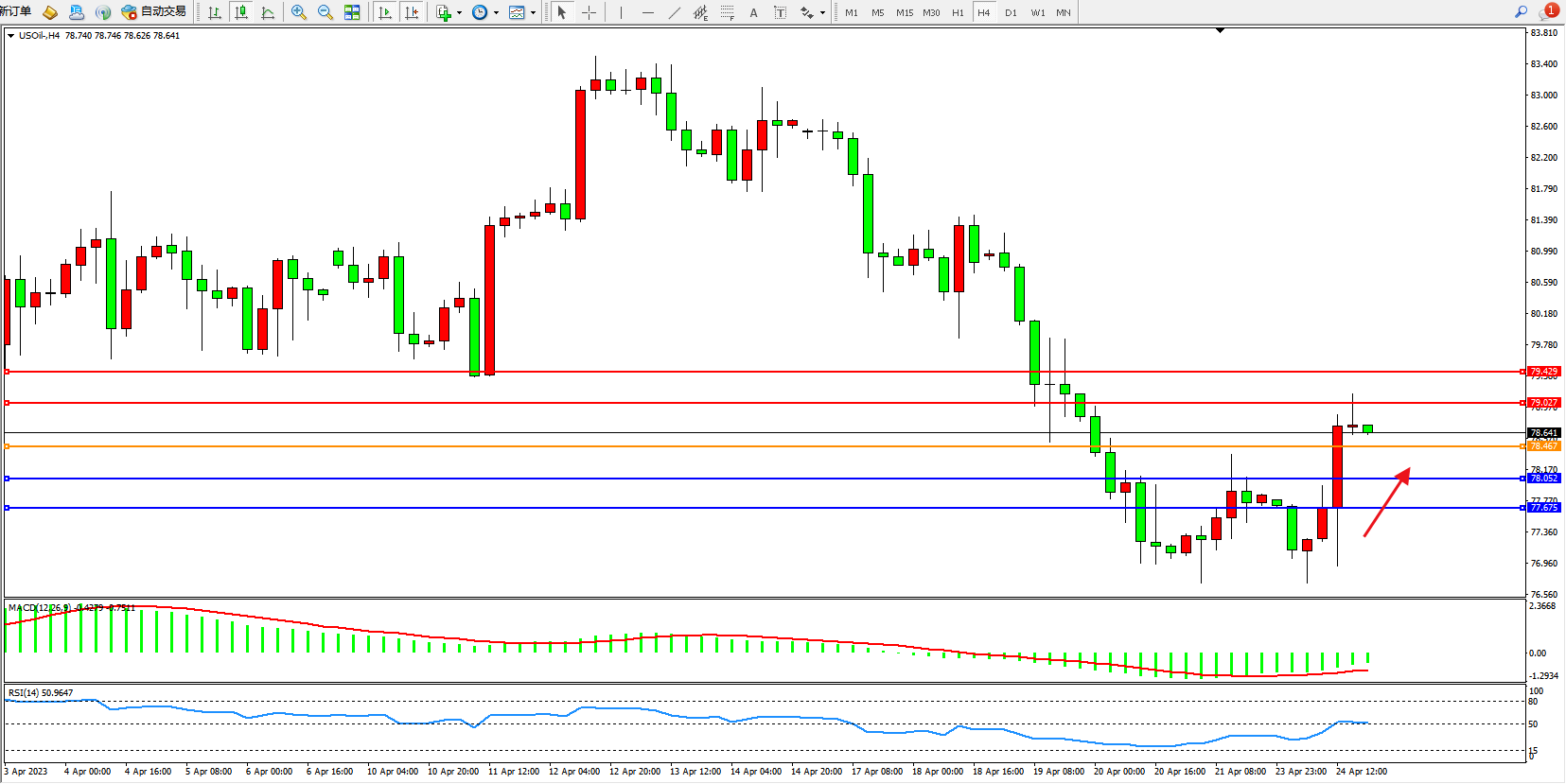 交易策略:78.467上方看涨,目标79.027 79.429