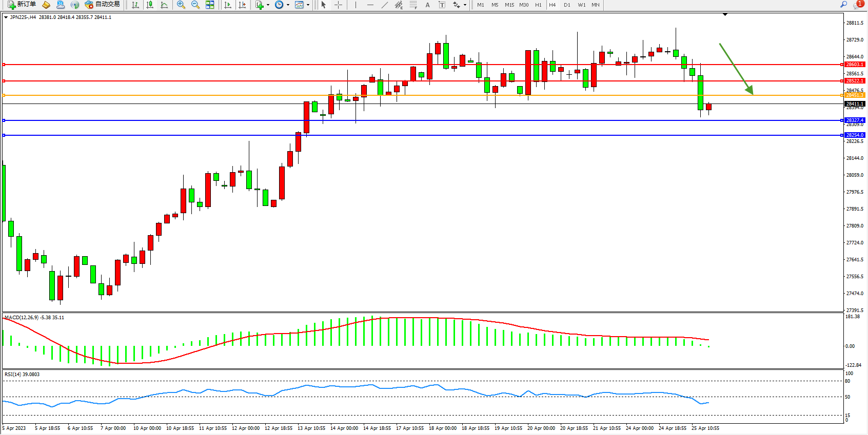 日经指数JPN225——4小时K线图显示: