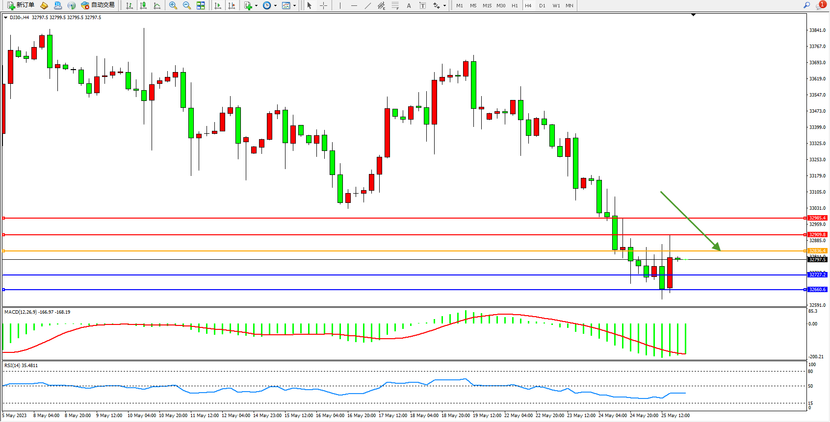 道琼斯指数DJ30——4小时K线图显示: