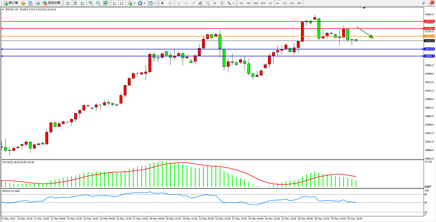 日经指数JPN225——4小时K线图显示:
