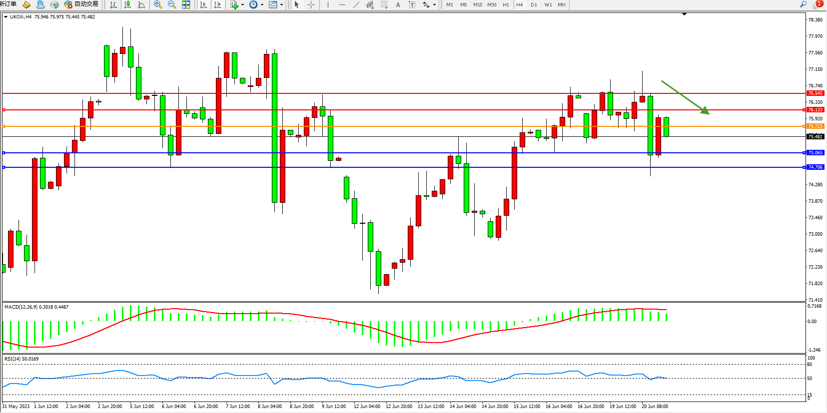 交易策略:75.723下方看跌,目标75.065  74.706