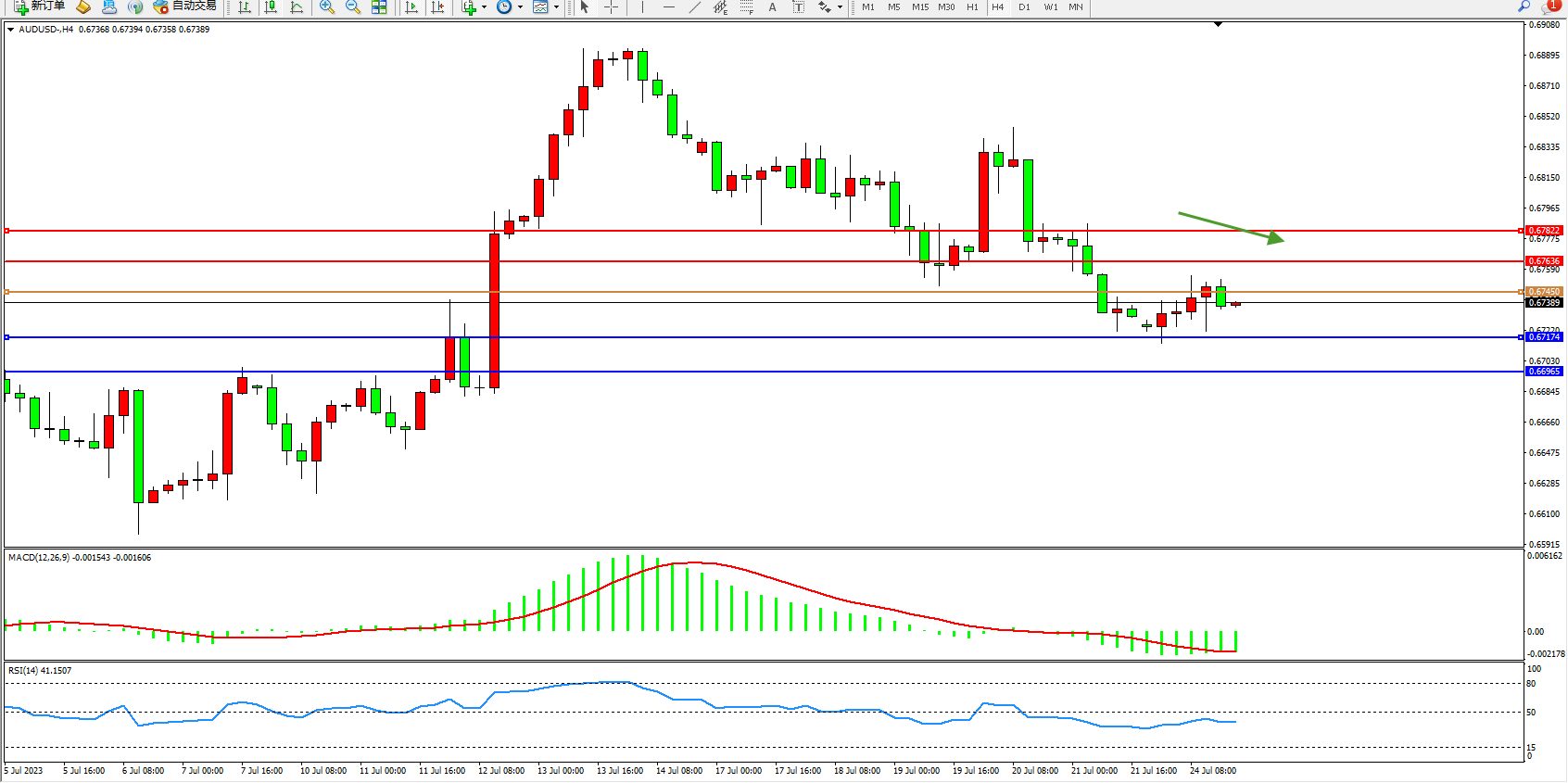 交易策略:0.67450下方看跌,目标0.67174  0.66965
