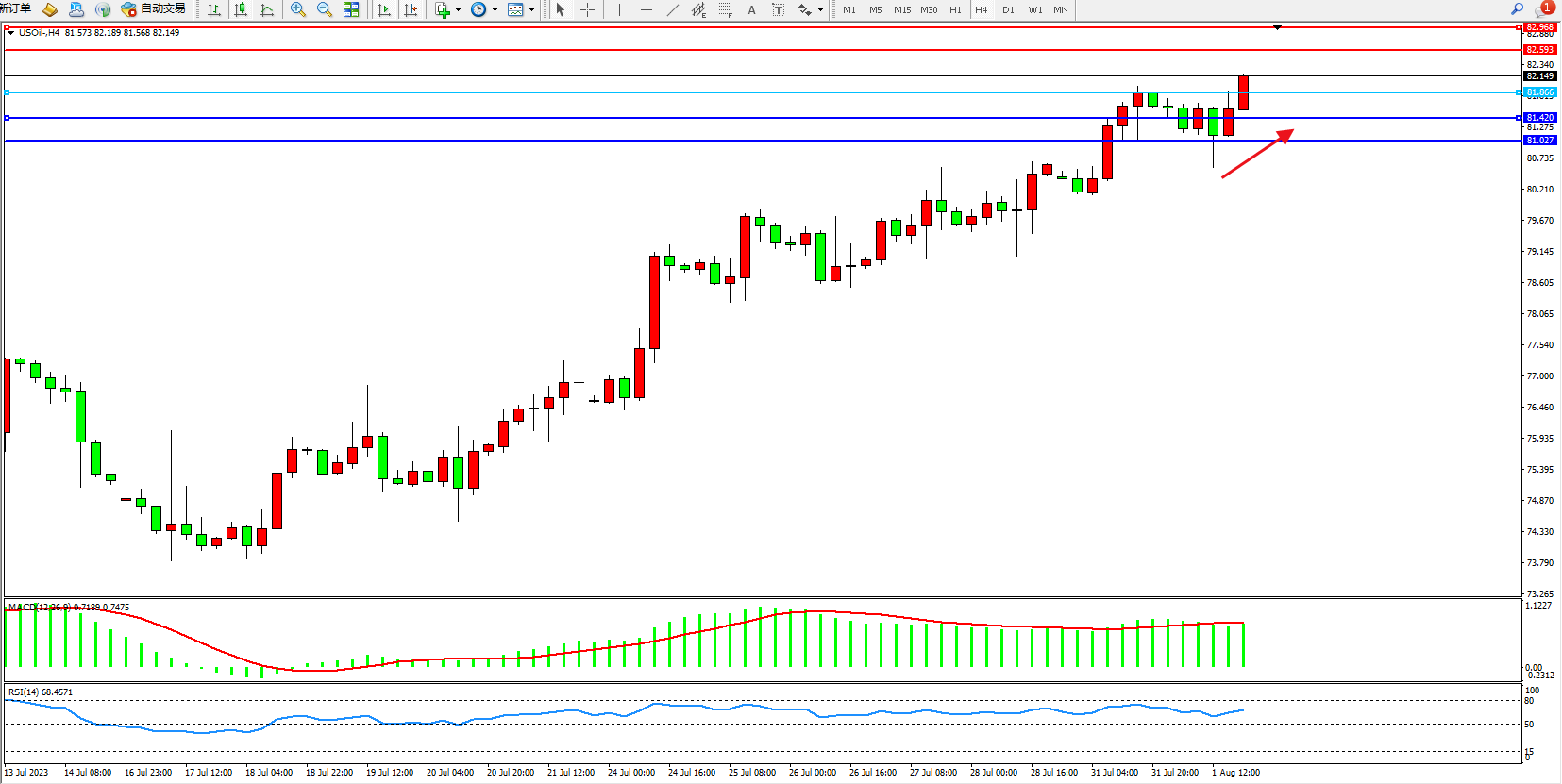 原油USOil——4小时K线图显示: