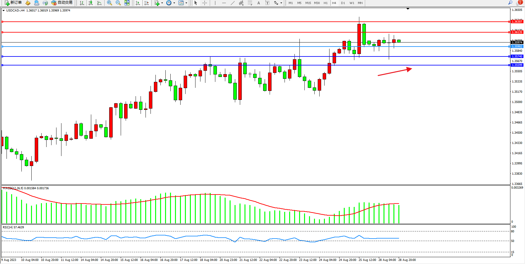 美元加元USDCAD——4小时K线图显示: