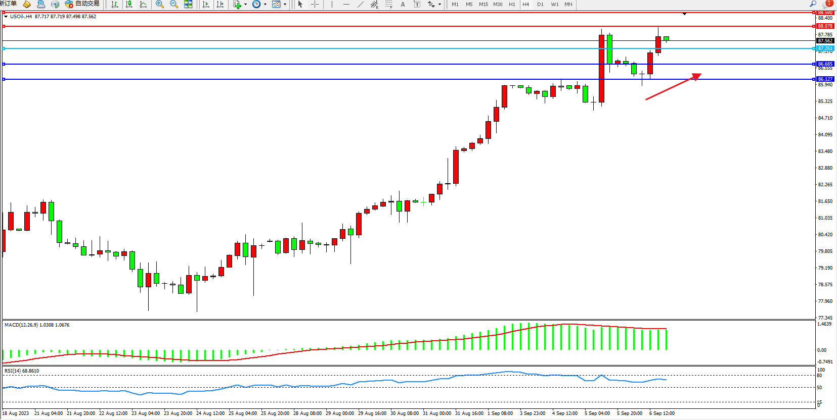 原油USOil——4小时K线图显示: