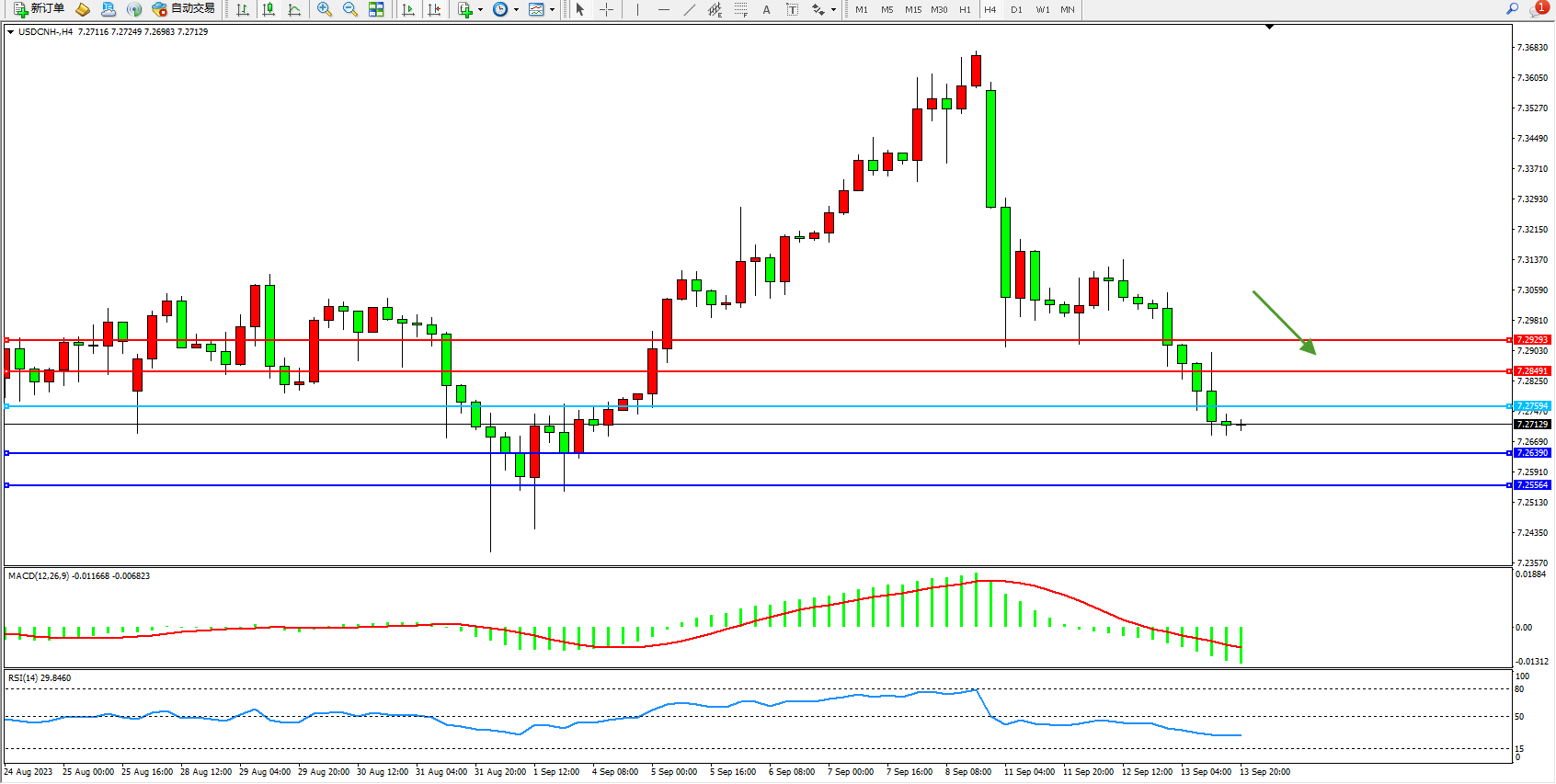 交易策略:7.27594下方看跌,目标7.26390 7.25564