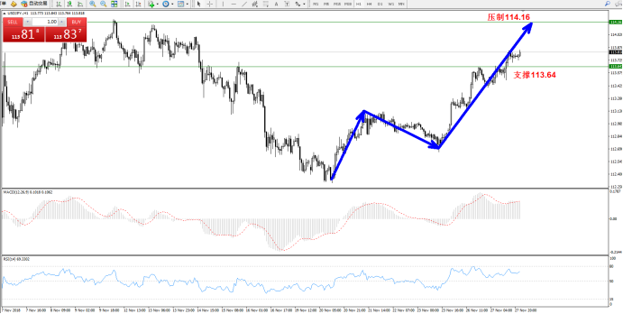 技术点评: 持续的多头节节攀升,有试图上攻前期高位的迹象,上方压制关注114.16附近,支撑关注113.64附近,MACD指标多头区域呈现长期稳定的上扬,RSI指标在多头区域有仰头上行态势;