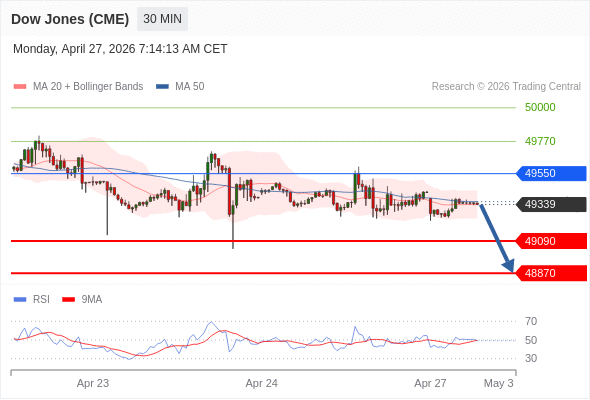 交易策略: 在 49550 之下,看跌,目标价位为 49090 ,然后为 48870 。