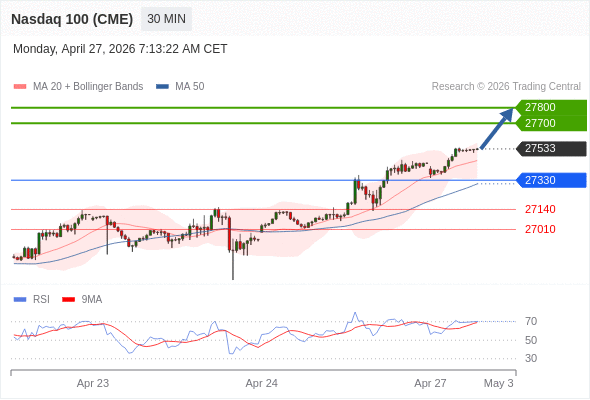 在 27330 之上,看涨,目标价位为 27700 ,然后为 27800 。
