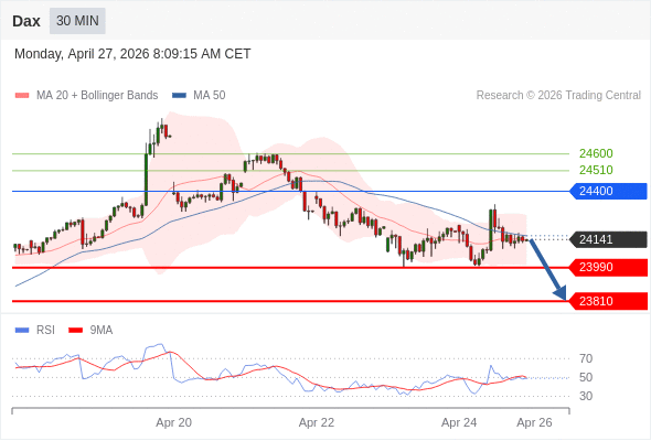 德国DAX指数 当日内: 短期关键阻力位在24400。
