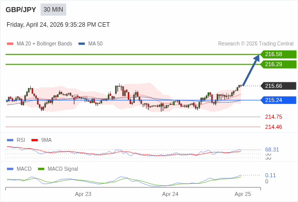 英镑/日元 当日内 : 看涨,当 215.24 为支撑位。