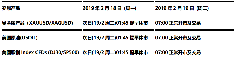 由于美国总统日假期 (2019218周一),以下交易产品的交易时间将受美国市场假期休市影响,敬请阁下留意知悉!