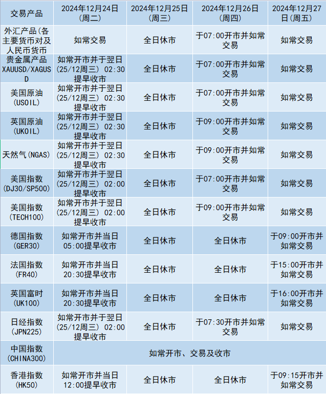 由于各地市场圣诞节假期影响,本公司以下产品的交易时间将于2024年12月24日(周二)至12月27日(周五)作出如下安排,敬请留意。