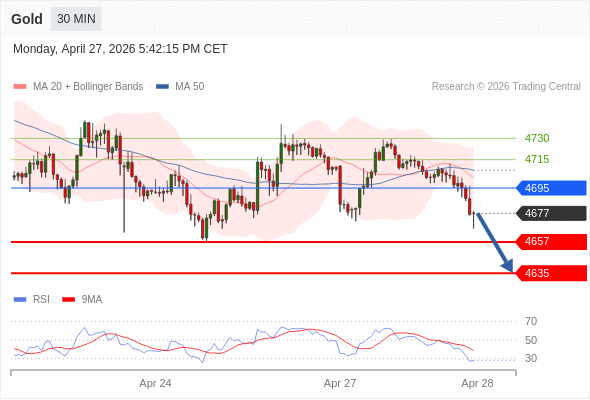 在 4695 之下,看跌,目标价位为 4657 ,然后为 4635 。