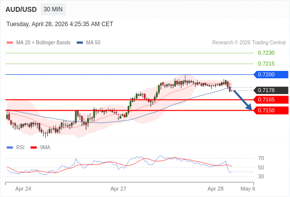 在 0.7200 之下,看跌,目标价位为 0.7165 ,然后为 0.7150 。
