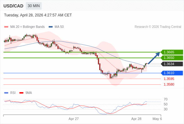 在 1.3610 之上,看涨,目标价位为 1.3650 ,然后为 1.3665 。