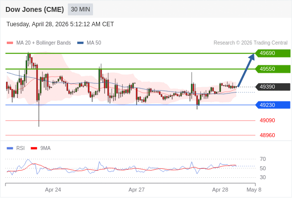 在 49230 之上,看涨,目标价位为 49550 ,然后为 49690 。