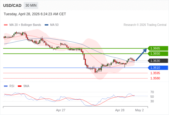 在 1.3610 之上,看涨,目标价位为 1.3650 ,然后为 1.3665 。