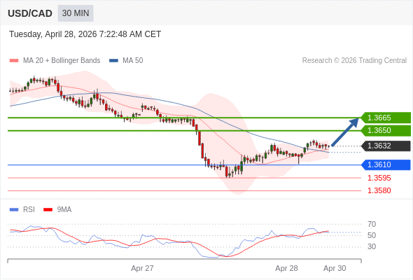 在 1.3610 之上,看涨,目标价位为 1.3650 ,然后为 1.3665 。