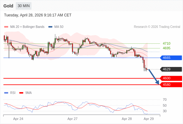 在 4665 之下,看跌,目标价位为 4600 ,然后为 4580 。