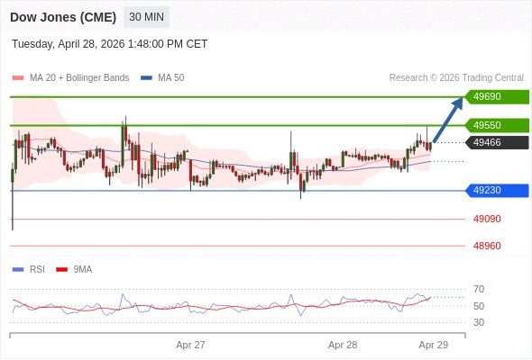 在 49230 之上,看涨,目标价位为 49550 ,然后为 49690 。