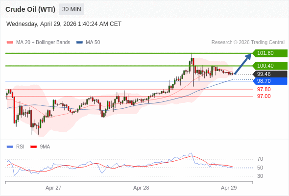 在 98.70 之上,看涨,目标价位为 100.40 ,然后为 101.80 。