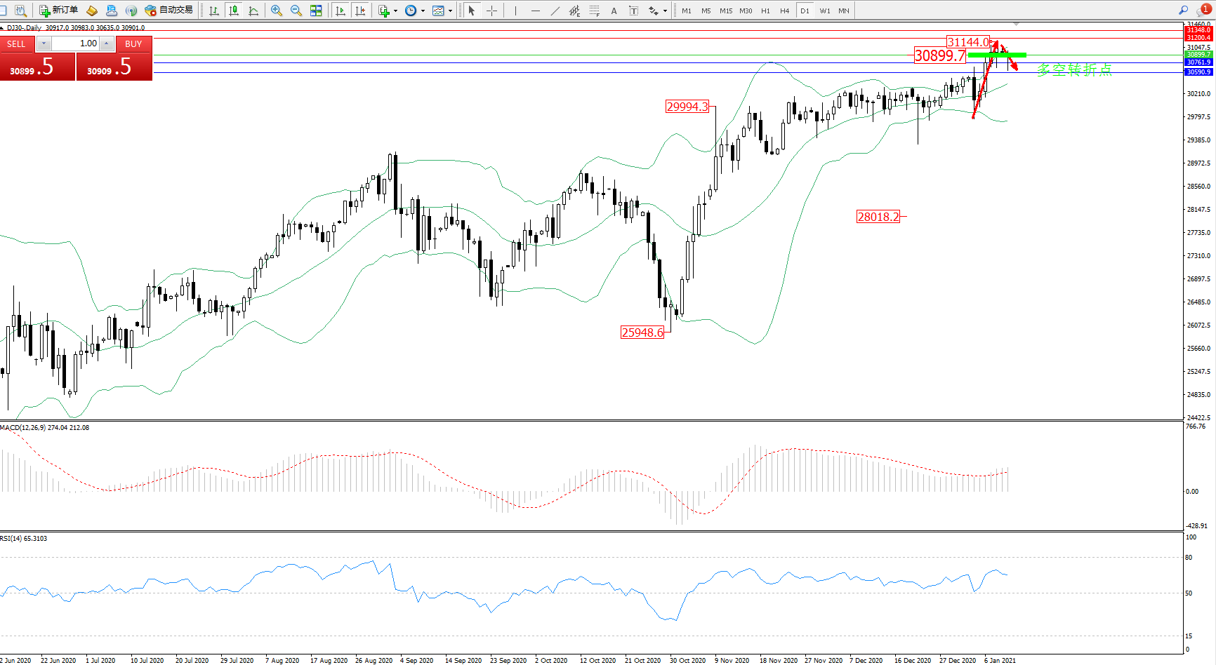 技术点评:多头动力延续布林带指标通道上轨附近弱势震荡向上移动中,高位抵达31144位置节点后出现整理回撤走势,布林带指标呈张口走势中,多头动力有继续拉升上扬态势,关注上轨附近关键节点,MACD指标处于0轴线上方多头区域维持整理平移后有向上移动迹象,RSI指标处于50均衡线上方多头区域维持震荡平移中;