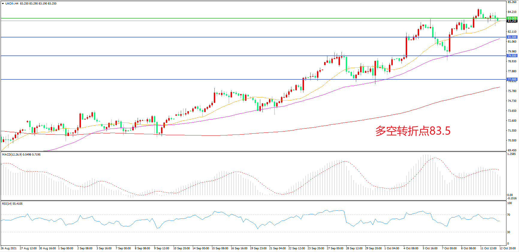 4小时图看,油价长阳拉升后延续高位震荡,多头趋势明显,均线系统呈多头排列,MACD红柱增加,RSI指标走平,日内延续上行概率较大。