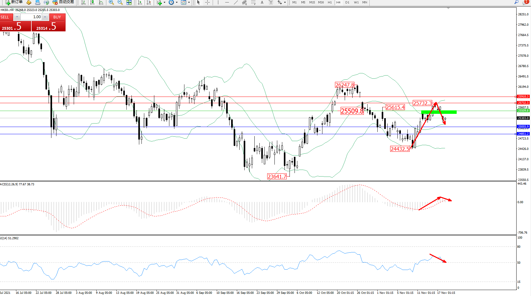 恒指HK50 ——4小时K线图显示:
