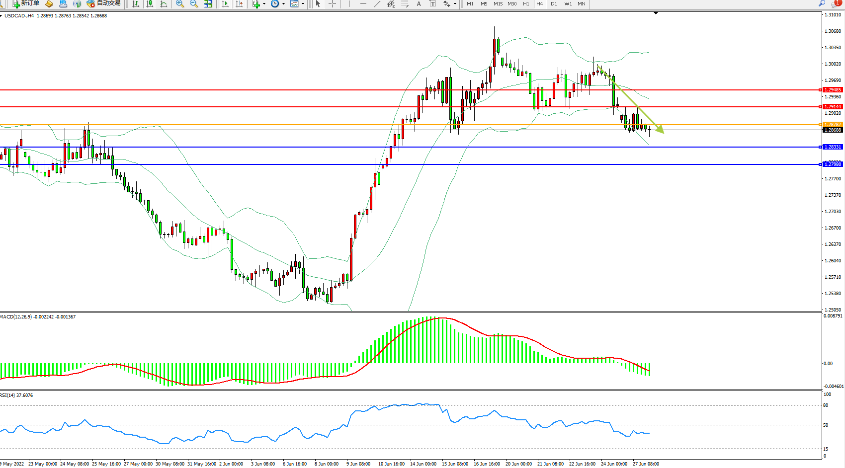 4小时图看:空头动力延续布林带指标下轨附近持续震荡向下移动,布林带指标呈缓慢张口走势持续中,MACD指标处于0轴线下侧弱势徘徊,RSI指标处于50均衡线下侧窄幅整理;
