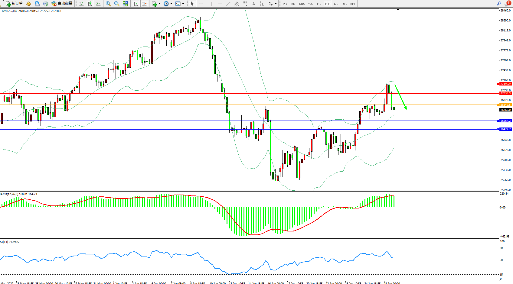 日经指数JPN225——4小时K线图显示:
