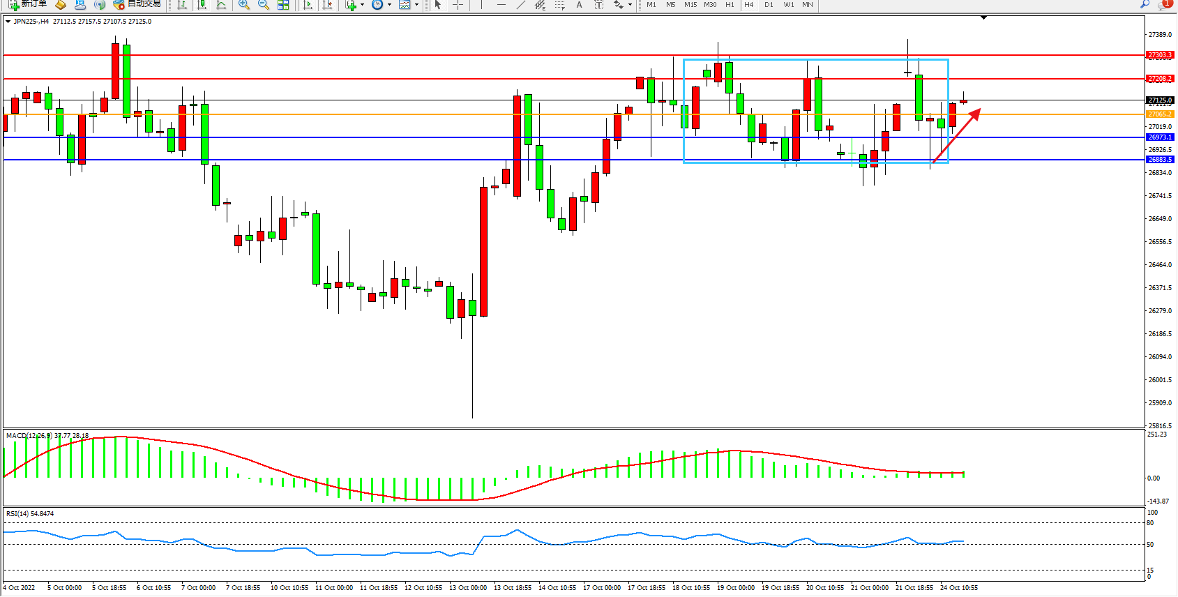 日经指数JPN225——4小时K线图显示: