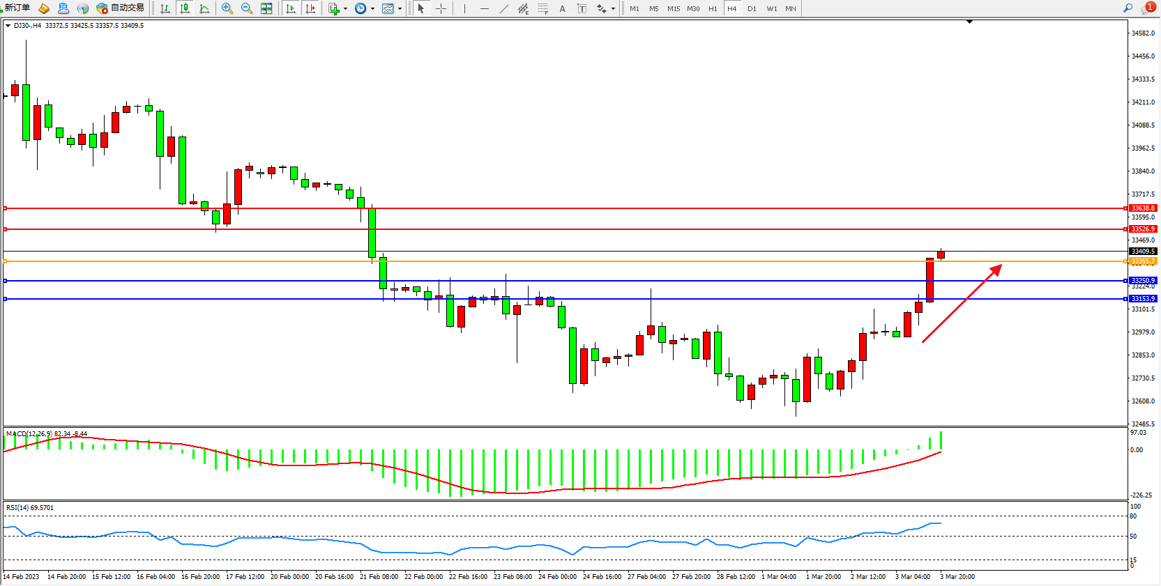 道琼斯指数DJ30——4小时K线图显示: