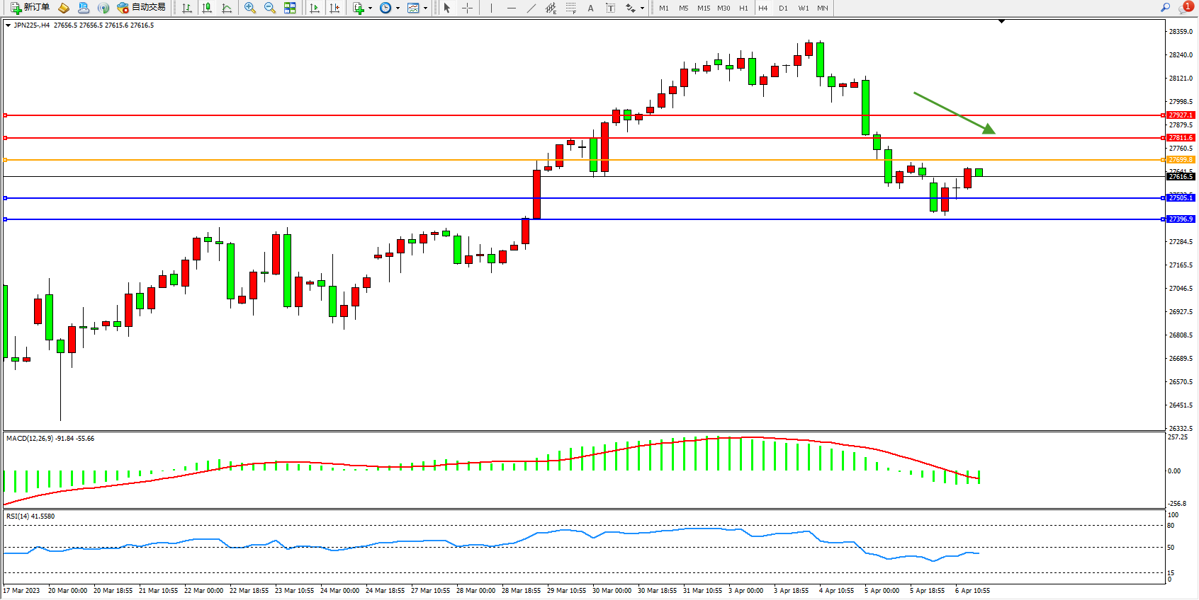日经指数JPN225——4小时K线图显示: