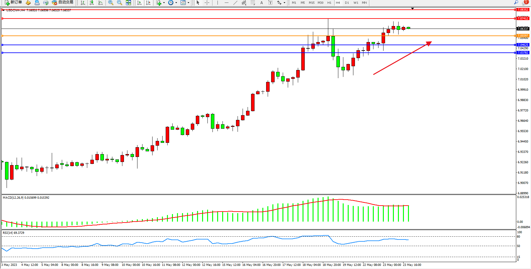 交易策略:7.05597上方看涨,目标7.07412  7.08352